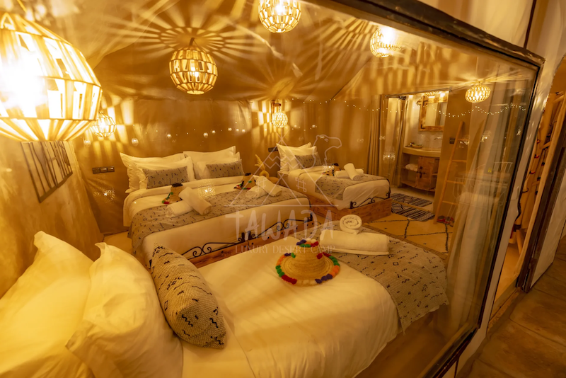 - 1 noche en campamento en el Desierto del Sahara (tienda privada con baño y aire acondicionado).