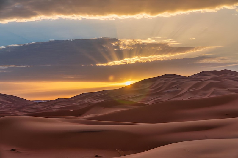 Enjoy a camel ride or 4×4 transfer to your desert camp. Watch a magical sunset over the dunes, followed by a traditional Moroccan dinner and Berber music around the campfire.